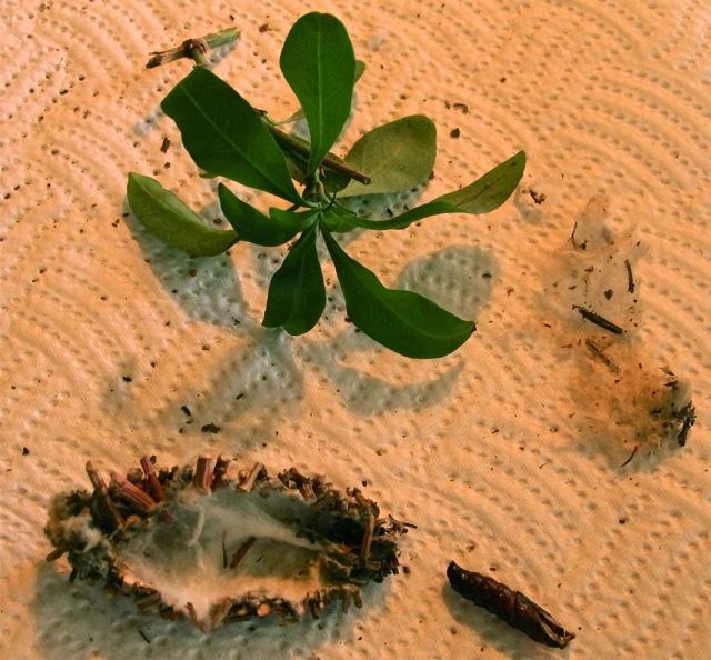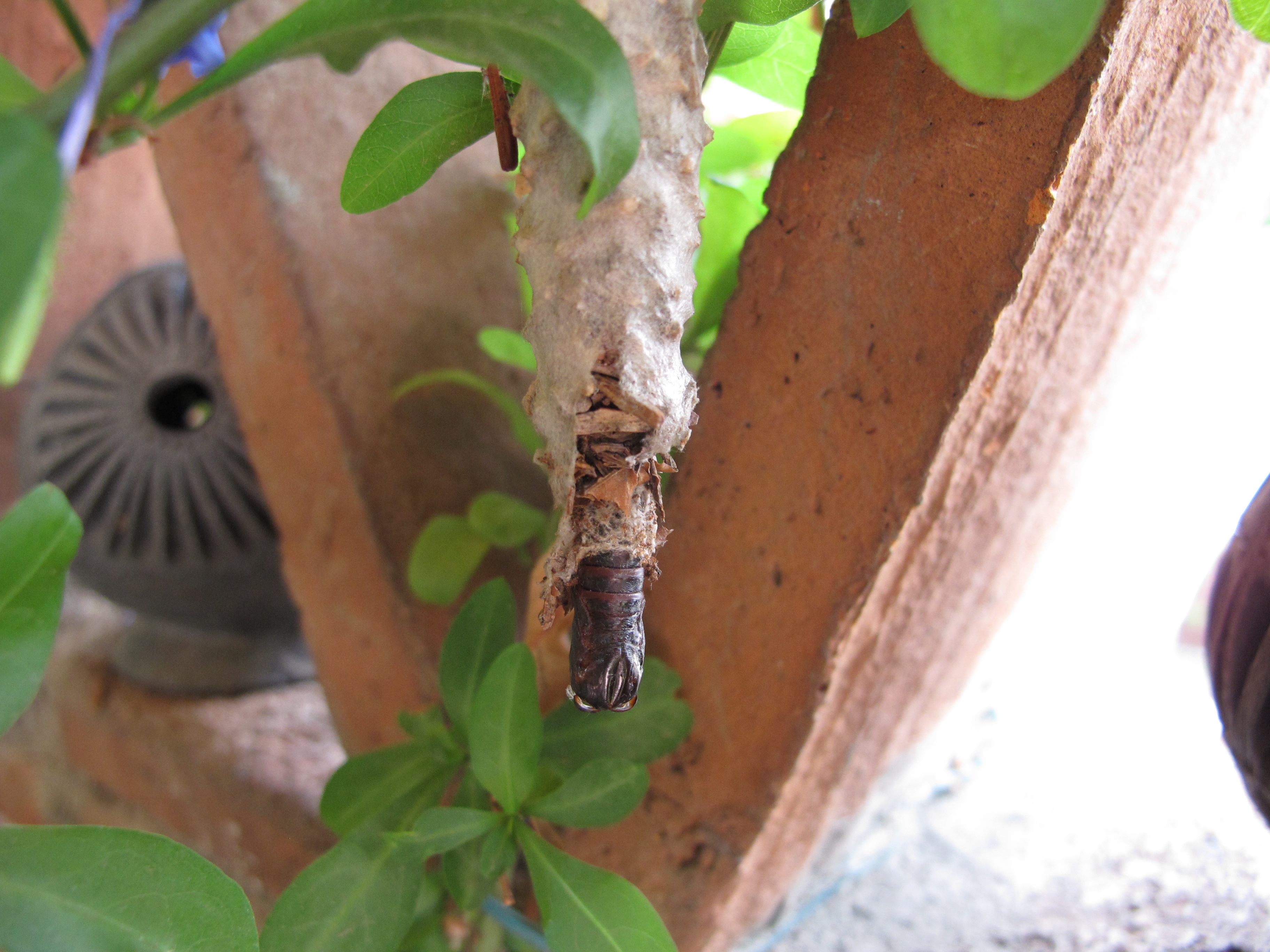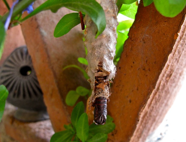 Back on January 10th, I posted a photo of a pupa that had materialized on my plumbago while I’d been up in the USA for a month.