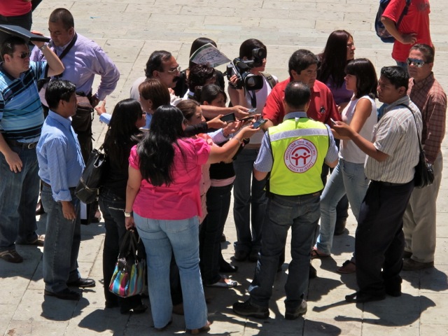 I continued on with my shopping and when I passed by the Palacio Municipal again, the media was all over the place, and more press conferences out on the sidewalk were being conducted. The fellow above is from the Proteccíon Civil Municipal of Oaxaca. The fellow below was speaking about the schools.