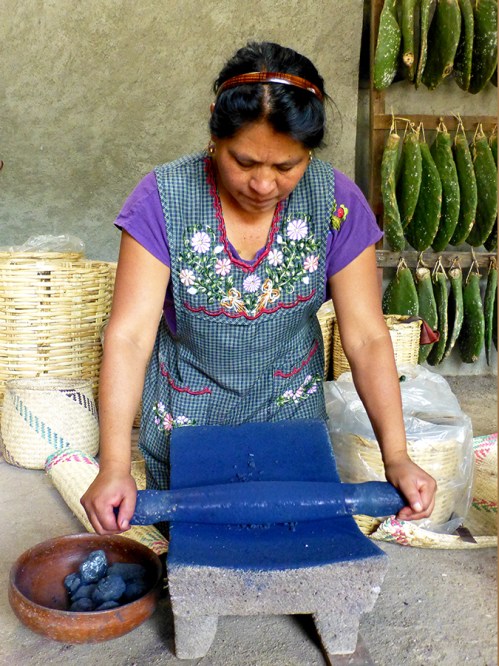 Juana Gutiérrez Contreras, grinding anil (indigo). She cleans wool, spins yarn, gathers herbs, master of natural dyes