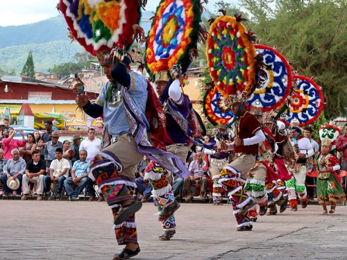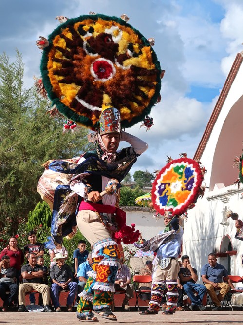 Yesterday, Teotitlán del Valle’s new Grupo de Promesa de la Danza de la Pluma 2019-2021 did battle, not only with Cortes, but also with the wind — which grabbed their penachos/coronas/headdresses like sails, challenging their balance, intricate footwork, and Busby Berkeley-like choreography.
