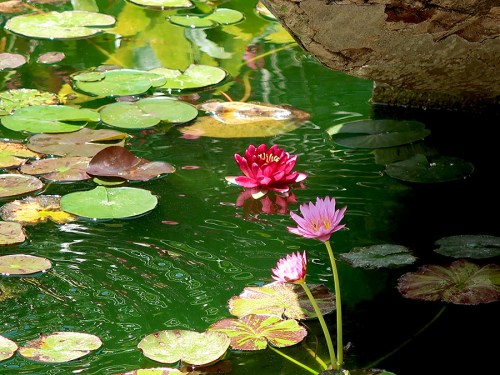 A water catchment system utilizing paths, beds, and ponds irrigate the garden and no chemicals are used.