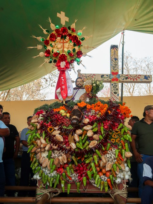 Jesús, known as San Salvador, atop a donkey festooned with the most succulent fruits, vegetables, and breads outside the panteón in San Antonino Castillo Velasco.