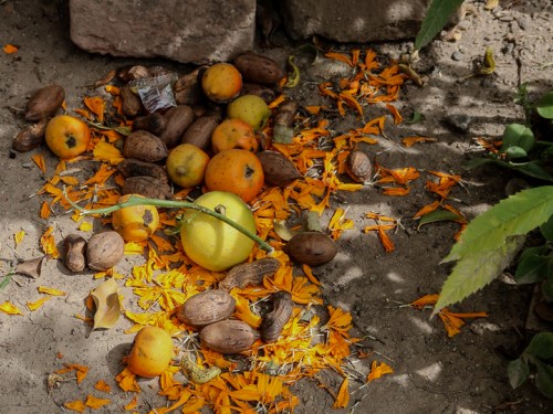 During Día de Muertos (Day of the Dead), under the sun dappled light filtering through graceful several centuries old ahuehuete trees in the panteón of Tlacolula de Matamoros, the living offer the scent of cempasúchil (marigolds) to guide their departed home. And, to nourish them during their journey between the worlds of the living and the dead, fruit (thoughtfully opened), along with nuts and beverages are provided.