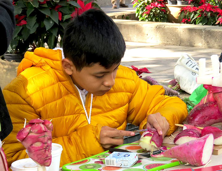 Young artisans at work carving radishes on the morning of the 2023 Noche de Rabanos.