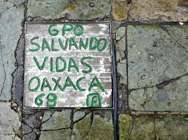 On the upside, the rain brings out the greens of the cantera. Though, I’m not sure where this concrete insert in the sidewalk at the corner of Independencia and Garcia Vigil came from or what it means. (Update: It’s Grupo: Salvando Vidas. Oaxaca — a volunteer group that has taken on the much needed task of repairing the city’s sidewalks muy peligrosas, saving lives and limbs! h/t, Peggy)