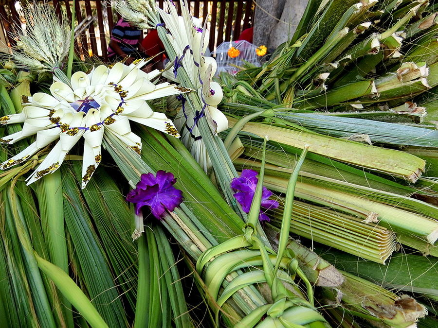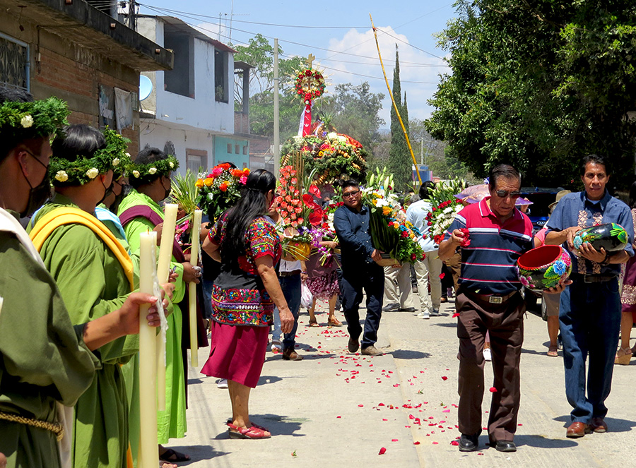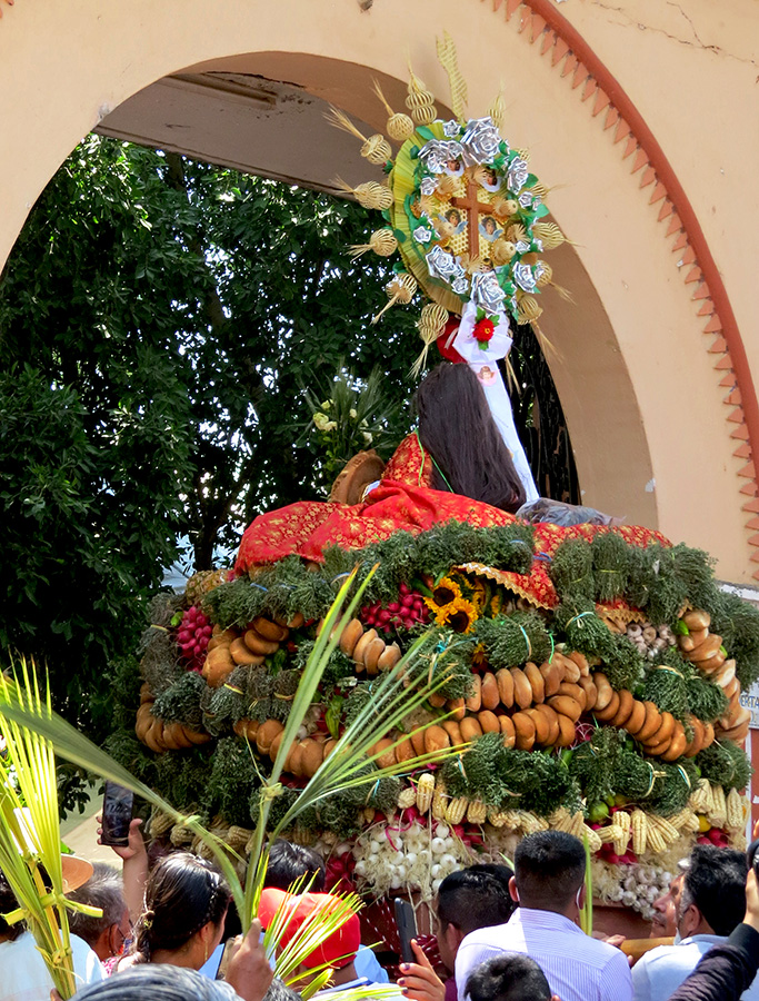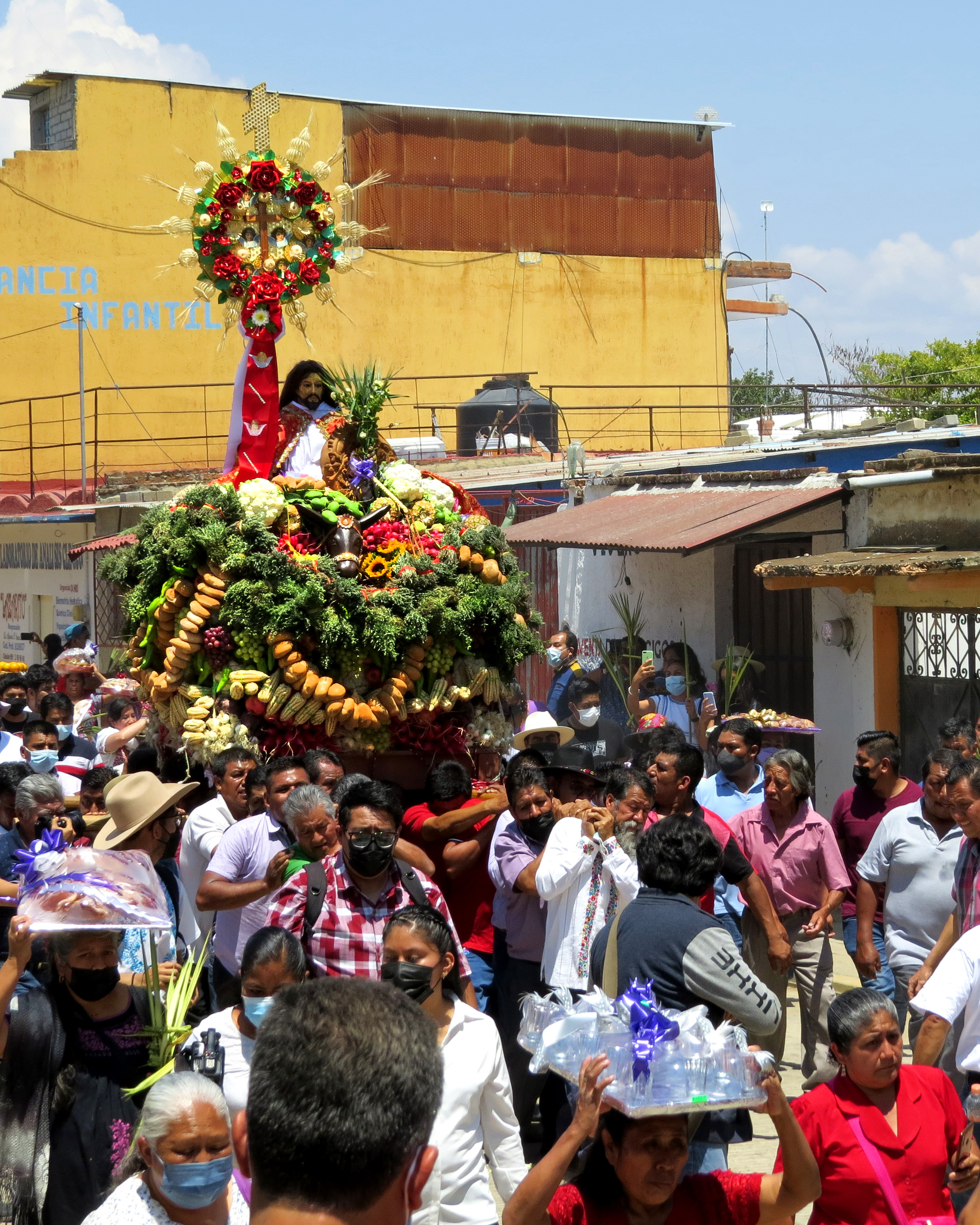 Once the burro was “filled to the brim,” with only his face peeking out, the priest arrived to bless the offerings and faithful with holy water. Dare I confess, it was hot under the noonday sun and the sprinkling of cold water felt good! The palm fronds, having been blessed, were distributed to all. Fireworks began exploding and the rhythmic sounds of the teponaxtles (drums) and chirimía (small oboe) began playing — announcing the start of the procession. Led by smoke from burning copal and a trail of bougainvillea bracts, the litter carrying San Salvador atop his burro set off on the kilometer long journey to the atrium of the church. They were accompanied by villagers and visitors clutching palm fronds and carrying the remainder of the goods collected.