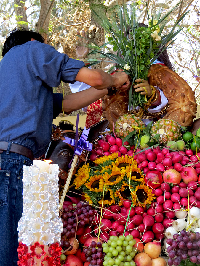 Jesús, known as San Salvador, atop a donkey festooned with the most succulent fruits, vegetables, and breads outside the panteón in San Antonino Castillo Velasco.