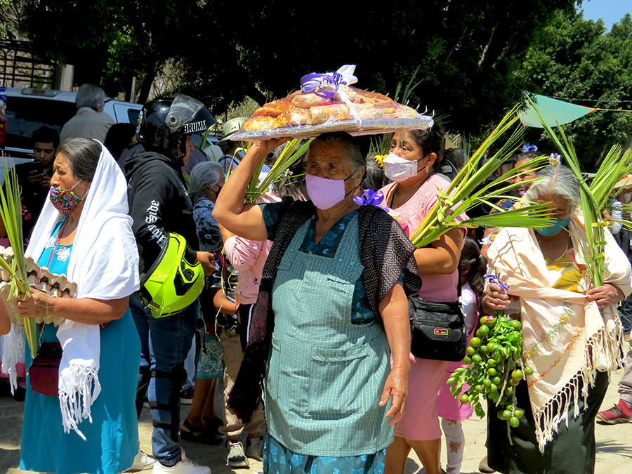 Covid precautions had caused the 2020 and 2021 Palm Sunday celebrations to be canceled. But, at long last, this year villagers, young and old, on bikes and on foot, in carts and in trucks, once again were allowed to return to the street outside the panteón (cemetery) bearing fruit, vegetables, herbs, breads, flowers…