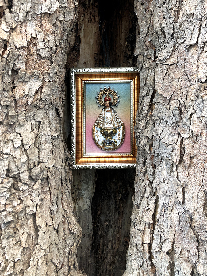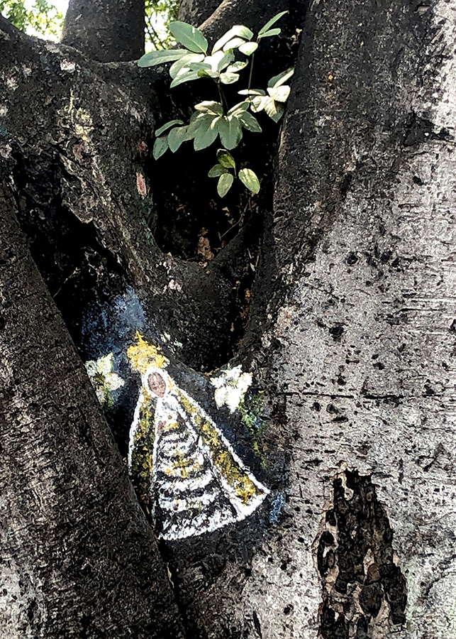 La Virgen de la Soledad painted into the crevice of an Indian Laurel tree in the Zócalo of Oaxaca city.