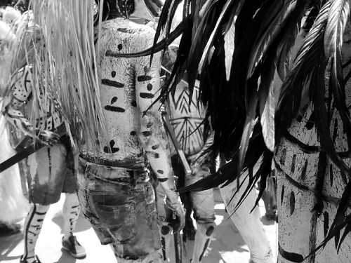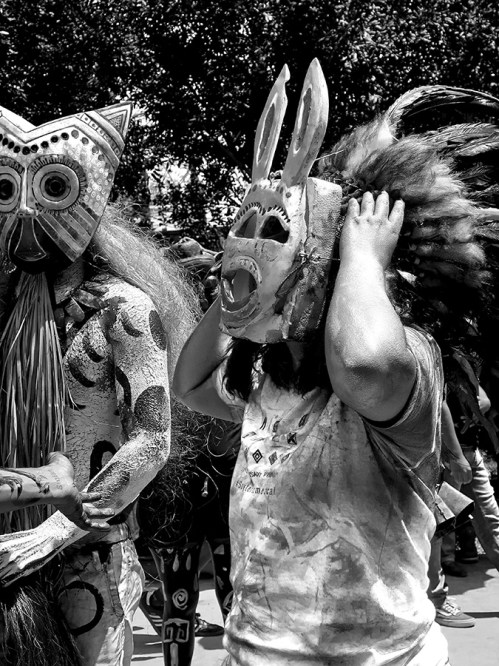 A little after noon, San Salvador (his burro now filled to the brim), offerings, and the faithful were blessed by the priest. Fireworks exploded, rhythmic sounds of the traditional teponaxtles (drums) and chirimía (small oboe) sounded, and led by a trail of bougainvillea bracts and the smoke of copal, the litter of San Salvador atop the burro and carried by 30+ men, set off on a journey to the atrium of the church. They were followed by villagers and visitors carrying the remainder of the goods collected — a ritual reenactment of the Biblical story of Jesus entering Jerusalem to celebrate the Passover.