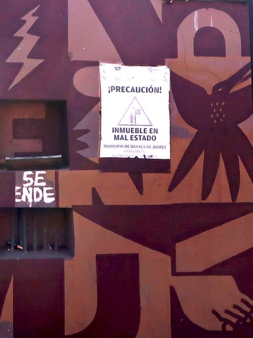 Remember the Not for sale! building at the corner of Matamoros and Crespo? It’s been one of the buildings in a “mal estado” (bad state) since long before my first visit to Oaxaca in 2007. A portion of the Crespo facing wall finally collapsed at the end of an extremely wet 2012 rainy season. And, following the September 2017 earthquakes, what remained of the wall gave way, necessitating a barricade along the sidewalk.