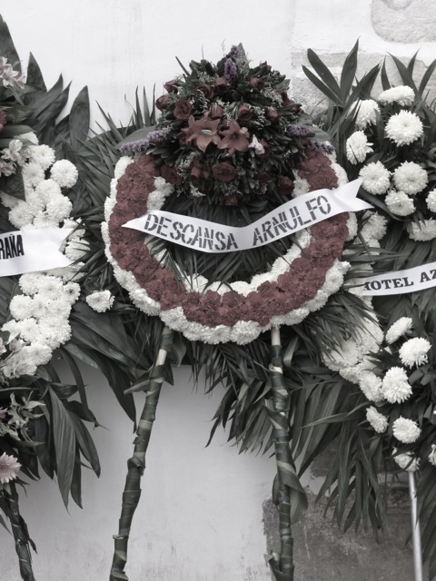 Floral wreath with ribbon reading, "Descansa Arnulfo"