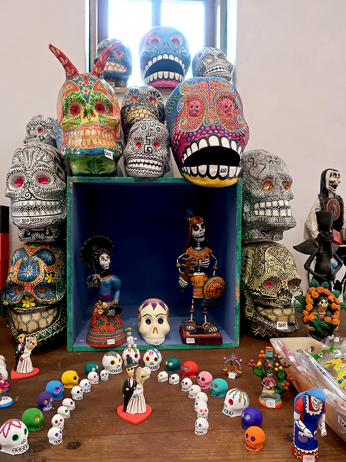 Every Día de Muertos, I love seeing the artistry of public ofrendas, feel honored being welcomed into the homes of friends and placing pan de muertos on their very personal ofrendas, and enjoy assembling my own ofrenda to departed loved ones. (Click on each image to see the details.)