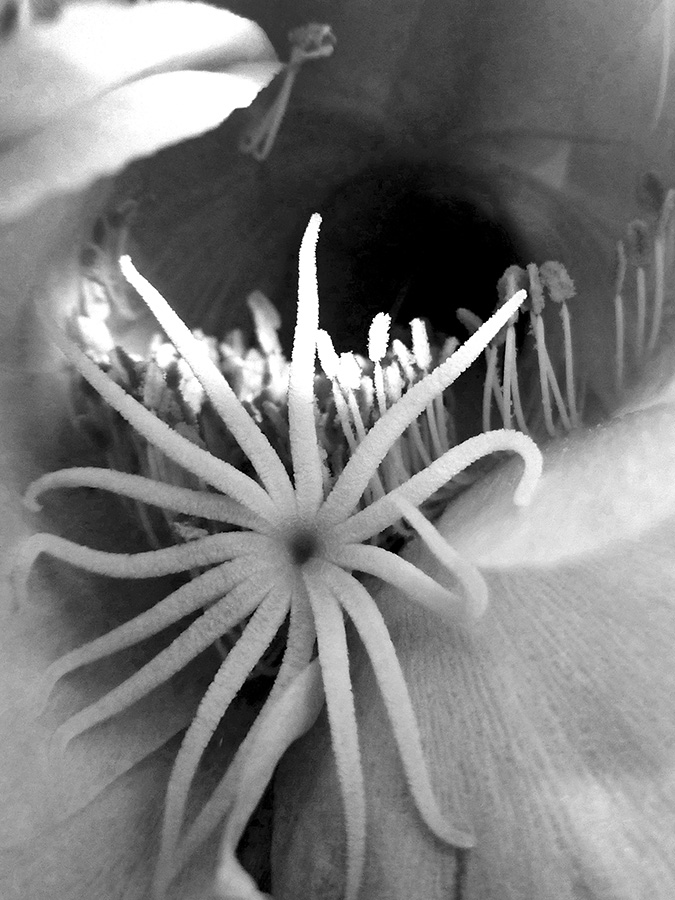 Late yesterday afternoon, it looked like a night blooming cereus blossom would burst open for it’s one night only orgy with the pollinators of darkness. I’m guessing the hours-long torrential tormenta that thundered over Oaxaca put a damper on the action. This morning found only an ever-so-slightly opened blossom. So here, in black and white, I bring to you, up close and personal, cereus reproductive organs in waiting.