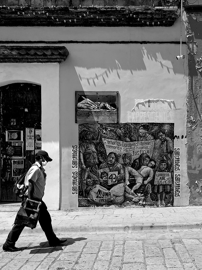 Posted in Creativity, Culture, Protests, Tragedy, Travel & Tourism, Violence, tagged Ayotzinapa, Black and white photography, bolero, disappeared, Mexico, normalistas, Oaxaca, photos, protest stencil art, shoeshiner, stencils, street art, student teachers, Subterráneos Art Collective, urban art, wall art on October 7, 2021| 4 Comments »