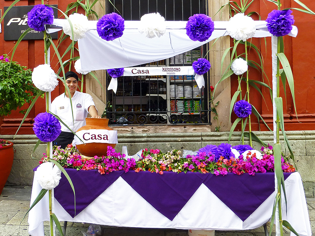 If it’s the fourth Friday of Lent and you are in Oaxaca, it must be Día de la Samaritana — a wonderful “only in Oaxaca” celebration. From bougainvillea decorated stands in doorways throughout the city and banquet tables lining the Alcalá in front of Templo de la Preciosa Sangre de Cristo…