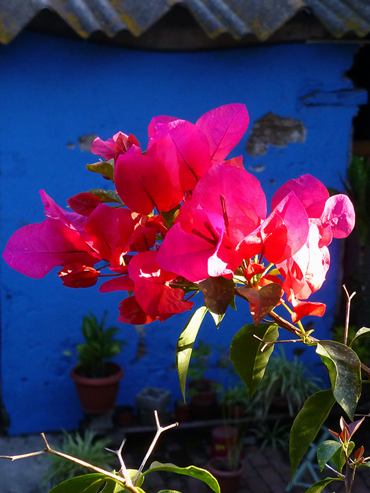 Light and shadow highlighted the Mexpost pink of the bougainvillea against the backdrop of a Frida Kahlo blue wall. Ahhh…