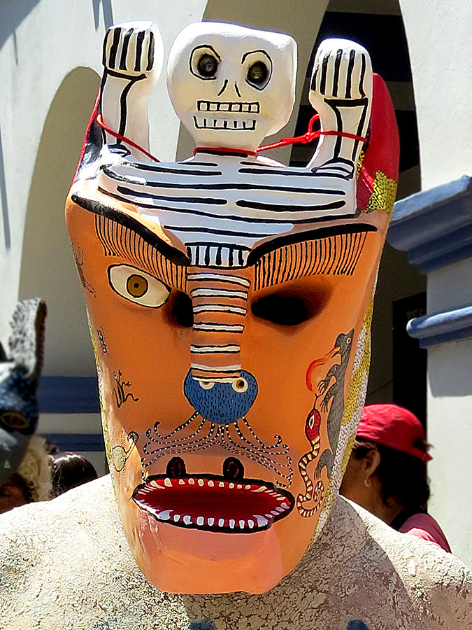Masks, all the better to hide one’s identity when making fun of the powers that be, are an international carnaval tradition.  Thus, in this village, known for its fantastically painted wood carvings, wooden masks play a big role in the celebration — including several by our friend Jesus Sosa Calvo and his family at Matlacihua Arte.