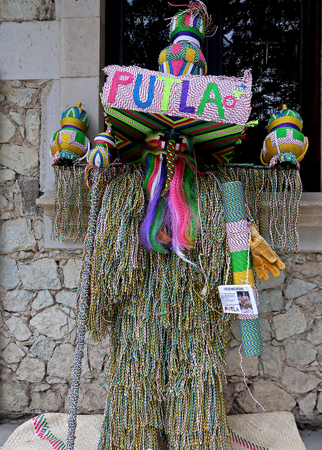 Designed by Ángel Álvarez de Jesús and made from plastic rope, plastic thread, cardboard and silicone. It took seven people 45 days to make for the 2019 costume contest in Putla. It weighs 60 kg. (132 lbs.)