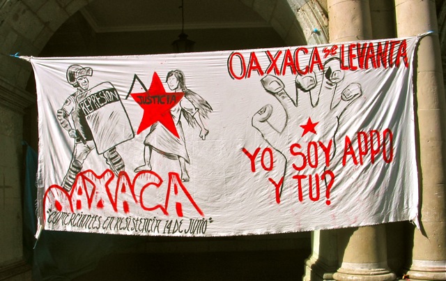 After a delightful but whirlwind (6 days is too short) visit, my stepson and his wife have come and gone; this year’s Guelaguetza festivities are over; life at Casita Colibrí is gradually resuming a more leisurely rhythm; and our current historic rain has gone on hiatus. A quiet solo Sunday morning walk beckoned, as did the APPO banners, strung along the arches of the Palacio de Gobierno, that I wanted to photograph.
