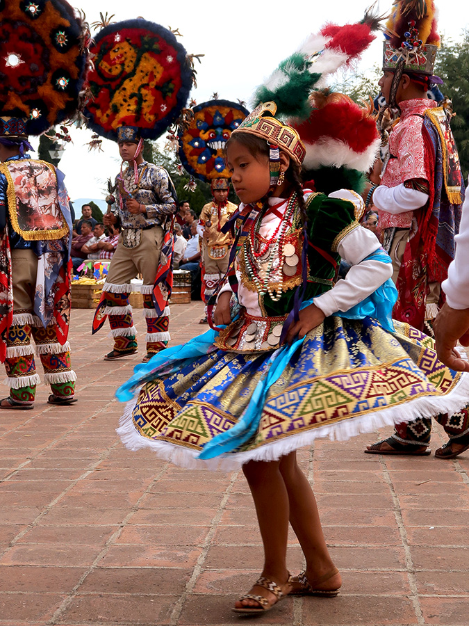 As you can see, the dance steps are complex and made all the more challenging by the wind, which comes up most late afternoons this time of year, catching the massive penachos (the headpieces) worn by the dancers. By the way, this day was the actual feast day so they danced for seven hours. I don’t know how they do it!