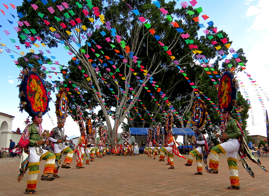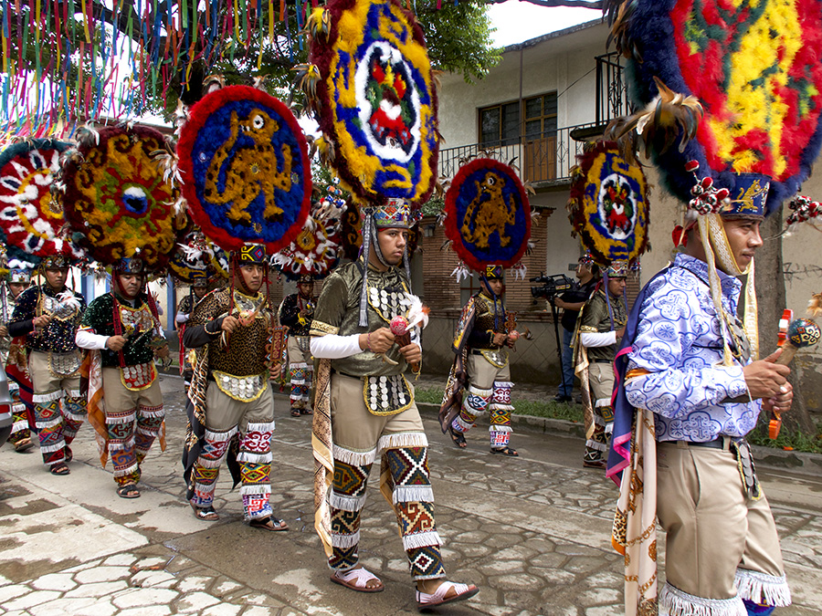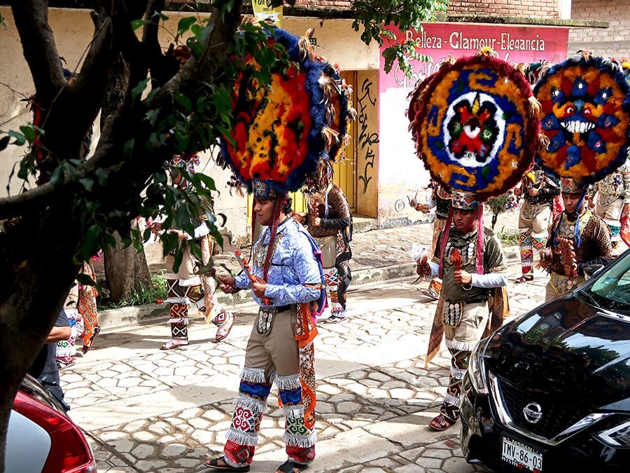 Danza de la Pluma danzantes, with rattles shaking, march and dance their way through the streets.