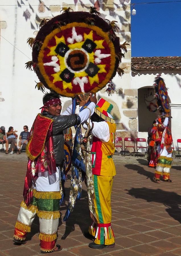 For two days following the previously mentioned convite inviting the villagers of Teotitlán del Valle and guests to the festival honoring the Virgen del Rosario (Virgin of the Rosary), the Danza de la Pluma was performed in the atrium of the church. The Danza de la Pluma is a ritual reenactment of the battles between the Aztec and the Spanish conquistadors. There are thirty nine dances that tell the story. This is the Chotis de 4 Reyes– a Schottische performed by the four kings allied with Moctezuma.