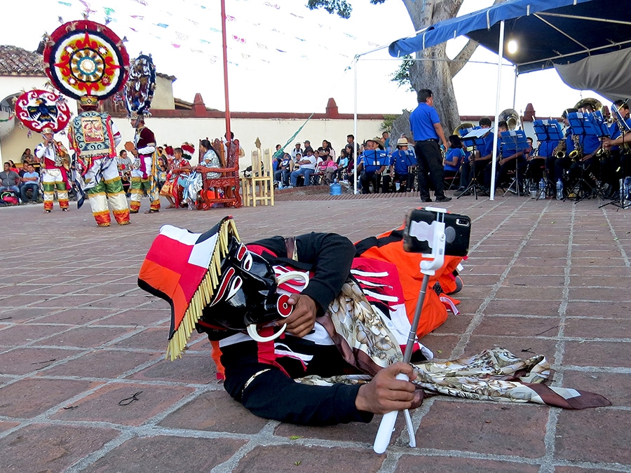 Putla de Guerrero unmasked tiliche dancer with cell phone in hand before the calenda begins.