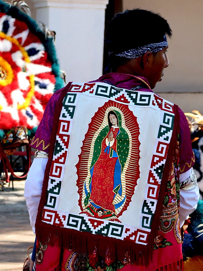 All over Mexico on December 12th the country pauses to honor and celebrate the Virgin de Guadalupe, also known as the Queen of Mexico, Empress of America, and patron saint of Mexico. And, there is no place I would rather be on this day than in Teotitlán del Valle watching the Danza de la Pluma. The dance is a ritual reenactment of the battles between the Aztec and the Spanish conquistadors. In this Zapotec village, the dancers make a 3-year religious commitment to perform it at the four major religious festivals each year, including Guadalupe.