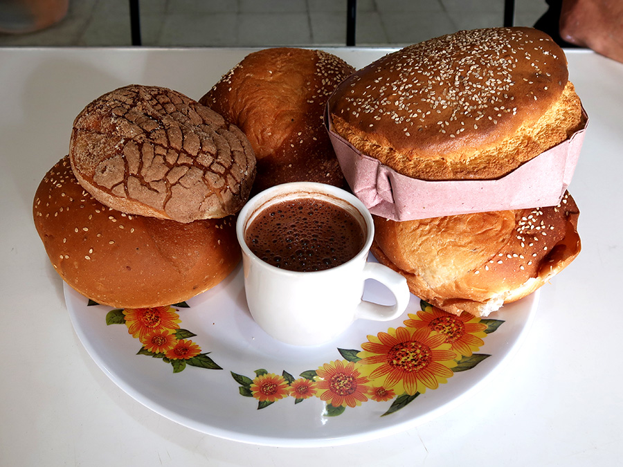 Hot chocolate with traditional breads.Grinding chocolate on metates for atole de espuma.Atole de espuma waiting to be served.Hugo Santiago Jimenez and Félix Contreras Ruiz eating higadito.