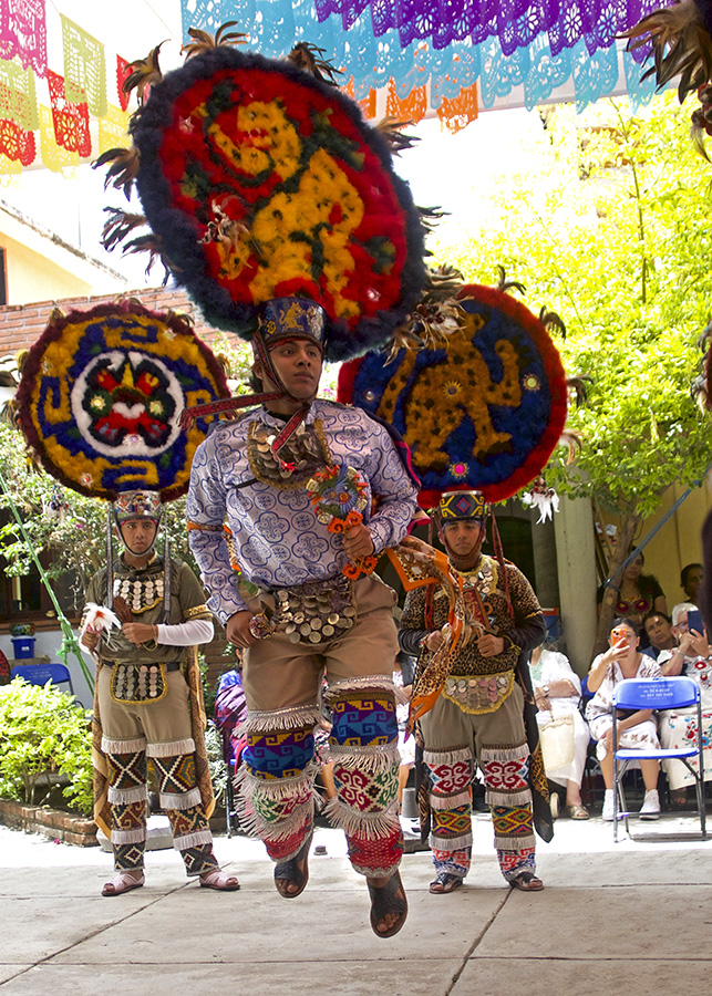 A 20+ piece orchestra accompanies the dancers, playing a musical score mostly comprised of waltzes, polkas, mazurkas, quadrilles, and schottisches. The first time I saw the Danza de la Pluma, I experienced a bit of cognitive dissonance at the contrast between the costumes and the music. A little research (after all, I’m a librarian) provided the explanation. At the end of the 19th century, when all things European were being celebrated in Mexico, an orchestra playing European music replaced the original indigenous teponaztli (drum) and chirimía (flute).