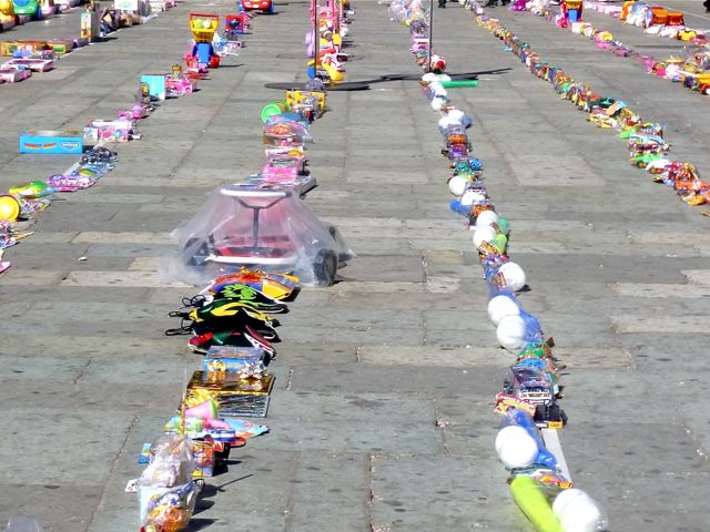 Yesterday, the municipal DIF (Desarrollo Integral de la Familia) agency and radio station “La Zeta Noticias,” sponsored a kilometer of toys — an annual toy drive for Oaxaca’s disadvantaged children. More than 3000 toys were collected to be distributed in a number of city and surrounding area neighborhoods. (Alas, only a fraction of the one million plus, 0 – 17 year olds, living in poverty in the state of Oaxaca.)