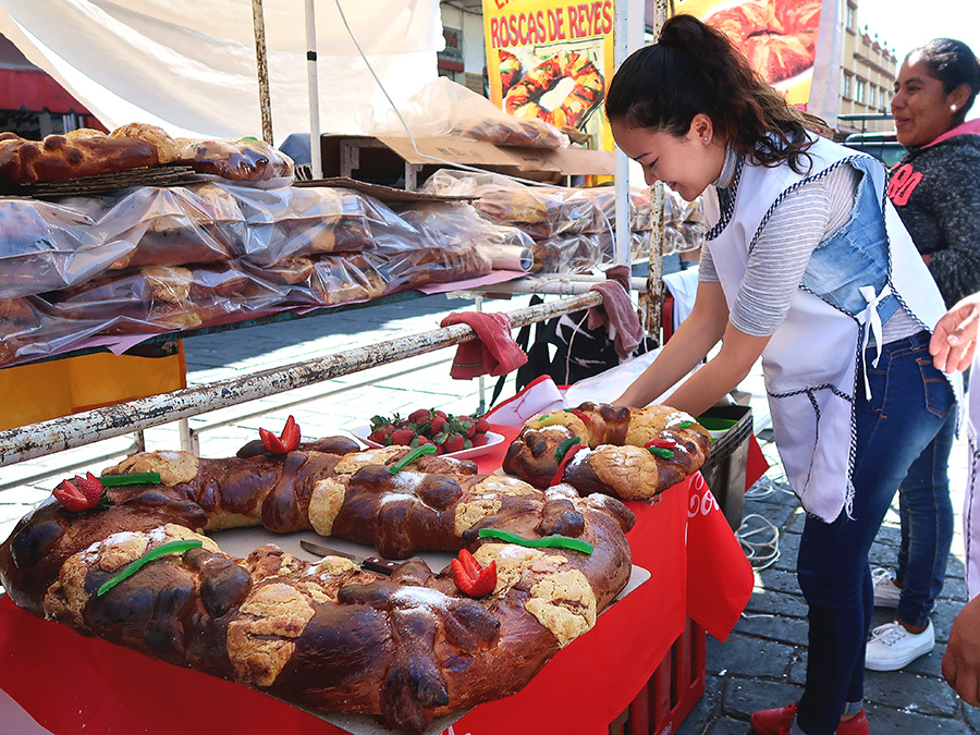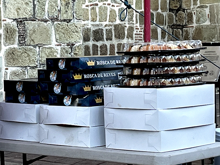 In addition to kings bringing kids gifts, January 6 also calls for a special cake — Rosca de Reyes (Three Kings bread). Bakeries have been working overtime and temporary stalls were set up on a block of Calle Flores Magón — closing it to auto and truck traffic (though motorcycles were a different story).