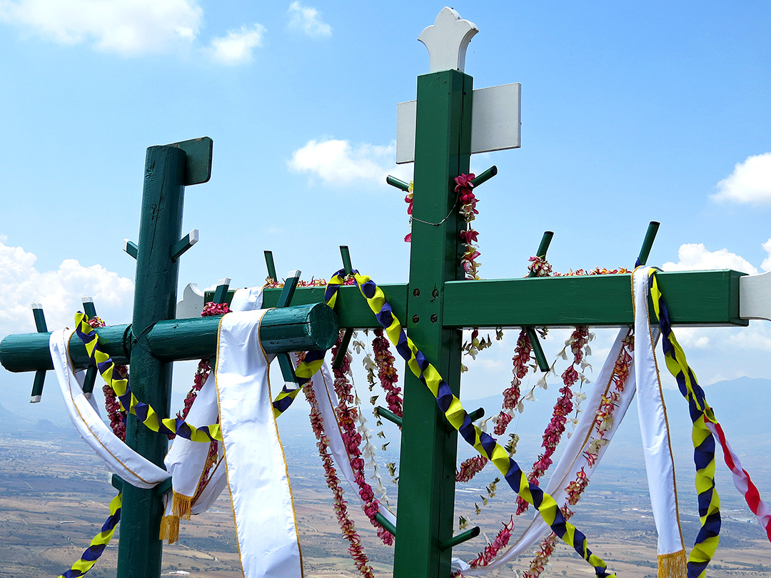 Three permanent crosses can be found atop Picacho and for Día de la Santa Cruz, all were decorated with fragrant garlands of frangipani blossoms.  A cross of concrete and stone crowns an altar and two wooden crosses, which I’ve been told were carved in Chiapas, preside above the altar and look out over the valley.