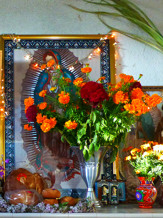 Our pan de muerto and mezcal joined the other offerings on the altar to provide nourishment to the departed while we, the living, sat down at the long table for a little cervesa, mezcal, and more than a few of the 500+ tamales Emilia had made.  After lots of eating and conversation, we walked across the courtyard to give our regards to Antonio Ruiz (weaver of one of my treasured rugs), wife Claudia, and their children (the beautiful Beatriz and her lively brothers, Diego and Antonito), and to see Antonio’s new showroom (Chris has a photo in his Familia blog post) and their altar.