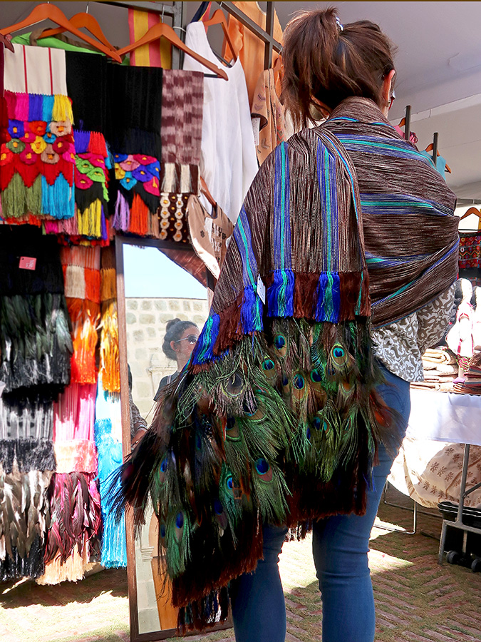 Friday, February first, the opening of the Museo Textil de Oaxaca expo-venta (show and sale) beckoned. Textiles from the Yucatán, Veracruz, Puebla, the State of Mexico, Michoacán, and (of course) Oaxaca filled tables and display racks. It’s hard not to feel overwhelmed by the color and beauty and workmanship, but I’m learning. I take my time, make several rounds of the booths, and then see what calls me back.