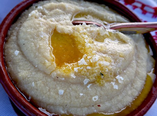 Bocado crujiente de maíz nuevo con queso de puerco.