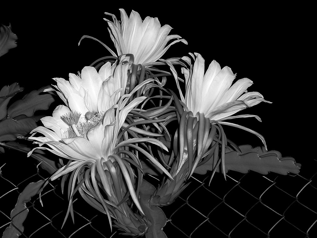 In a few months, there will be a red luscious dragon fruit, like this one on a neighboring stalk. I miss the pitahayas that used to climb the chain link fence surrounding my terrace.