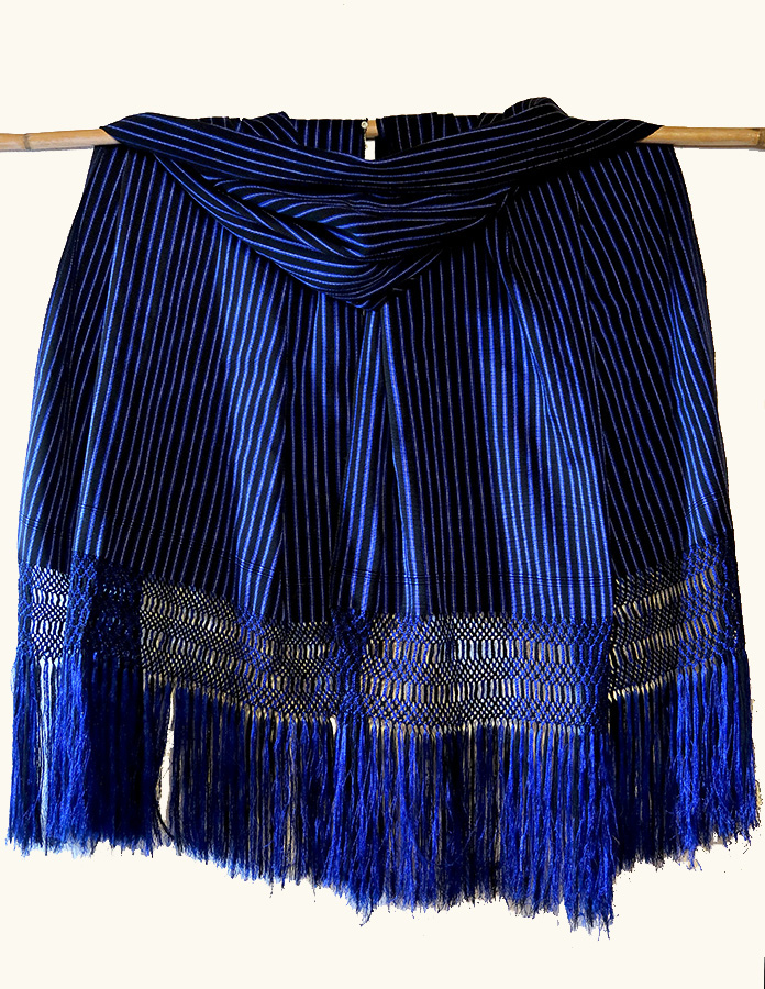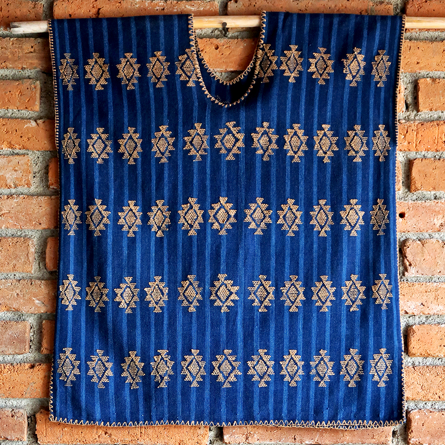 The indigo and coyuche brocade huipil above is from the Mixtec village of Pinotepa de Don Luis and was the first in my trio of purchases. It was woven by a woman named Sebastiána and I bought it in response to an appeal by Stephanie Schneiderman to help support the weavers of that area during these pandemic days. It spoke to me the minute I saw it among the selection of huipiles for sale. Stephanie helped facilitate shipping it from Pinotepa de Don Luis to Oaxaca city and within a couple of weeks, it was hanging in my closet.