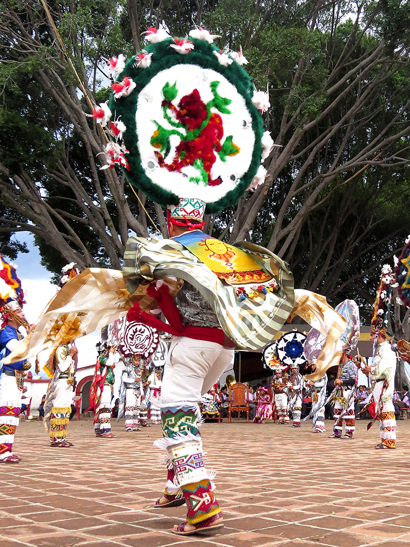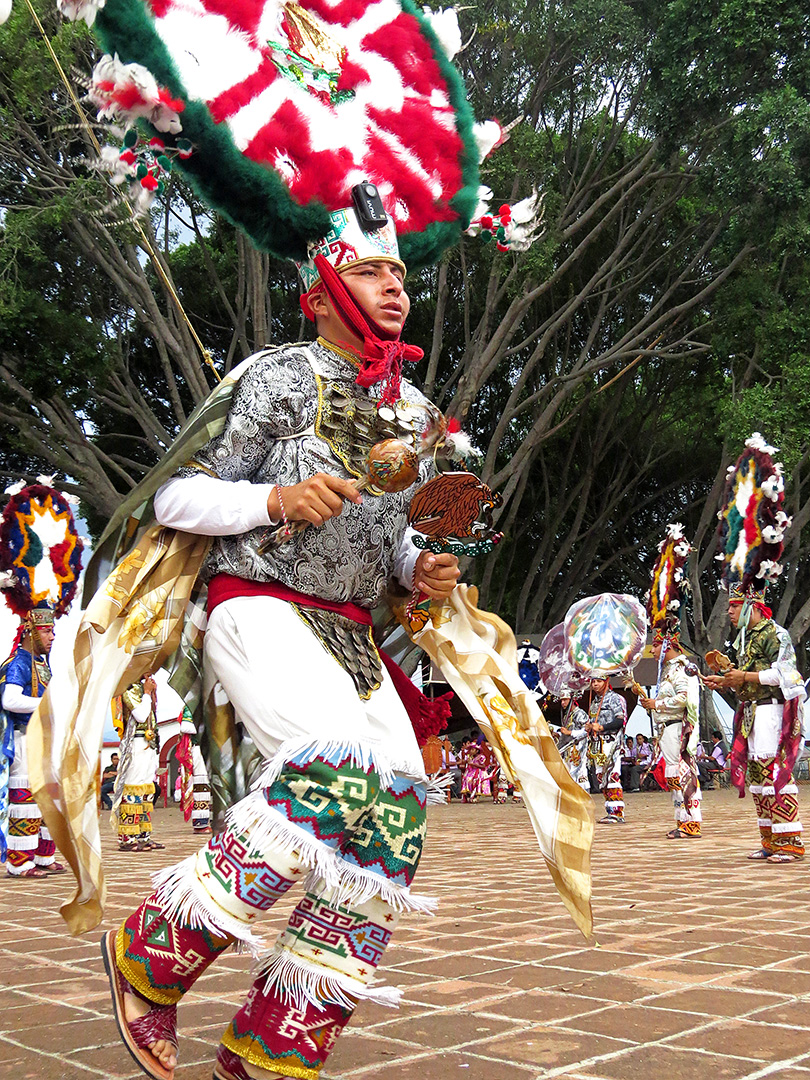 A 20+ piece orchestra accompanies the dancers, playing a musical score mostly comprised of waltzes, polkas, mazurkas, quadrilles, and schottisches. The first time I saw the Danza de la Pluma, I experienced a bit of cognitive dissonance at the contrast between the costumes and the music. A little research (after all, I’m a librarian) provided the explanation. At the end of the 19th century, when all things European were being celebrated in Mexico, an orchestra playing European music replaced the original indigenous teponaztli (drum) and chirimía (flute).