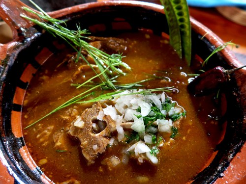 When chef Celia Florian announced that her restaurant, Las Quince Letras, would be featuring Mole de Caderas for a month, mi amiga (and cocinera) Kalisa and I made a beeline. Mole de Caderas is a traditional Mixtec dish from Huajuapan de León, Oaxaca and nearby Tehuacán, Puebla. It is made from the hip (cadera) and the spine of a goat that has been fed a salt-based diet to give the broth a unique flavor. It is only served during the fall, when the goats are made to make the ultimate sacrifice — and was absolutely delicious!