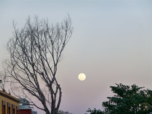 On this Lunes Santo, the (almost) full moon watched standard bearers navigate the maze of overhead wires as the procession continued to wind its way through the city’s streets. As for me, I returned home to eat dinner — there is so much going on, one has to pace oneself.
