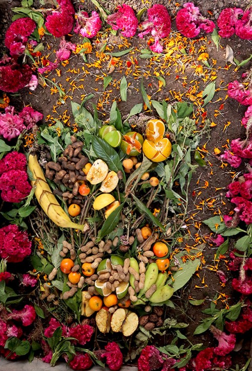 Under the dappled sunlight filtering through the 500 year old ahuehuete trees in the panteón of Tlacolula de Matamoros, lovingly placed fruit and nuts nourish the souls. (Click on images to enlarge)