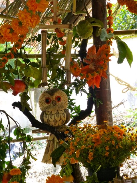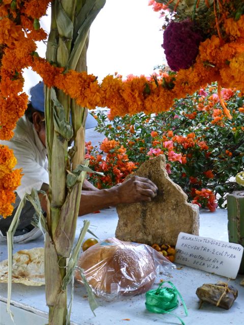 However, in the indigenous villages these days are more solemn, filled with ritual, and are family oriented. I lean toward this more spiritual observance, so I escaped the craziness of the daily comparsas and drunken crowds in the city and went to stay in the Zapotec village of Teotitlán del Valle with my compadres (including comadre K) and to shop in Tlacolula for pan de muertos (bread), candles, and flowers to take to the ofrendas of families K and I have a relationship with in Teotitlán and San Pablo Villa de Mitla.