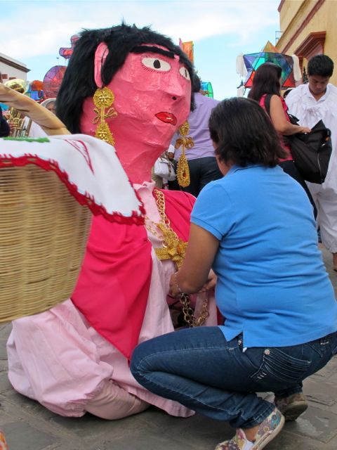 Yesterday, we headed about 20 miles southeast of the city to Tlacolula de Matamoros for their calenda (parade) in honor of la Virgen del Rosario (the Virgin of the Rosary). While we go to Tlacolula often, especially for their Sunday market, and while we’ve been to countless calendas, this particular one was a first — and what fun it was!