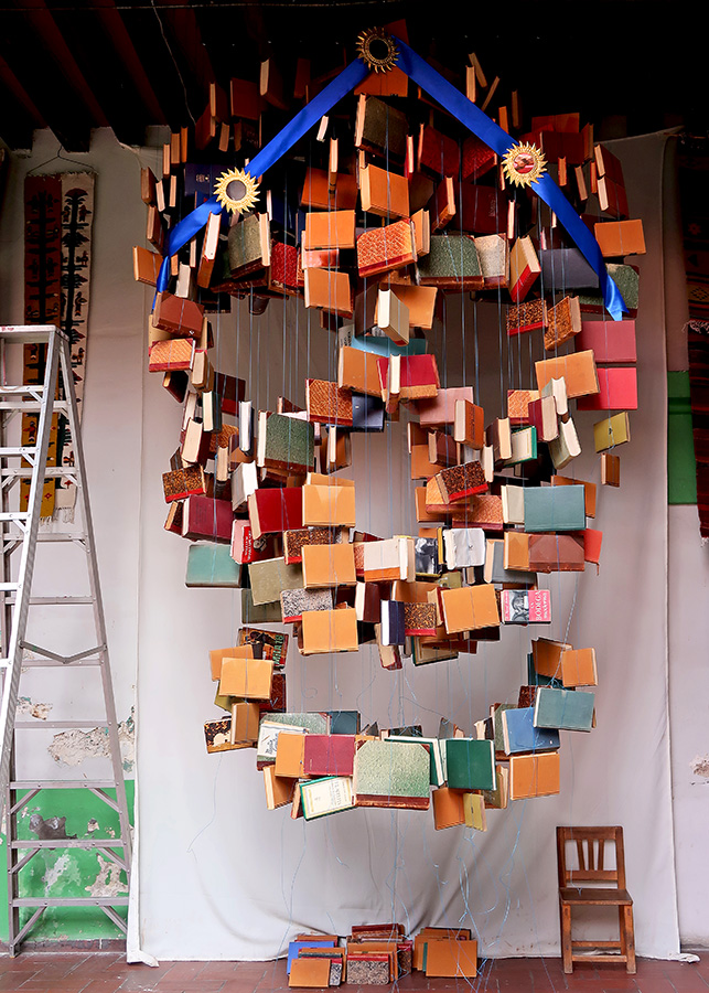 Open doors always draw the eye; you never know what you will see. Peering through doorway of the Biblioteca de la Fundación Bustamante Vasconcelos, never disappoints. Across the courtyard, seasonal book sculptures can often be seen. Currently, celebrating July’s Guelaguetza, a Tehuana’s bookish hand holds her jicapextle aloft.
