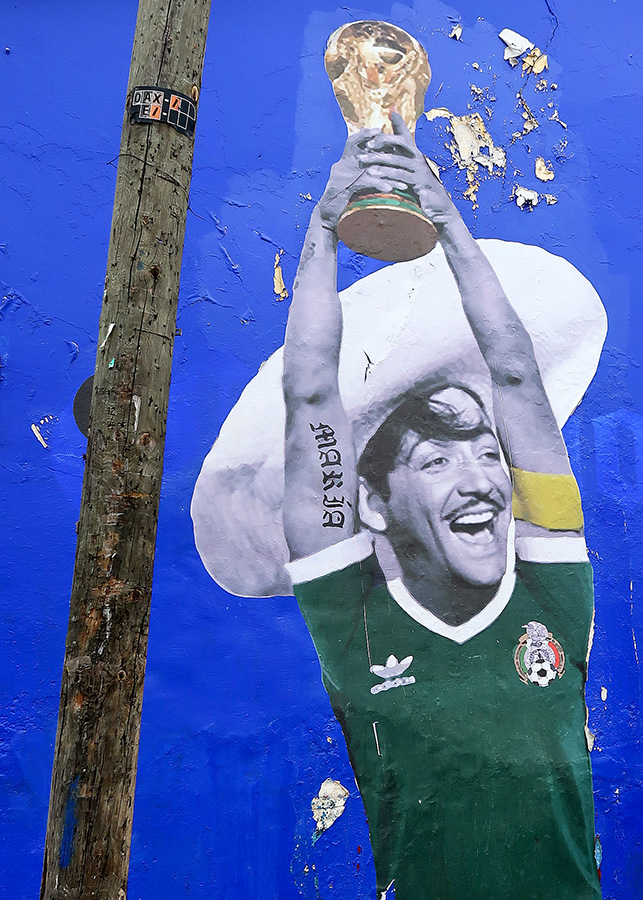 On the wall outside the Salon de la Fama cantina (corner of M. Bravo and Porfirio Diaz), artist Efedefroy captured the mashup dreams of Mexican football (soccer) fans. The beloved singer/actor Jorge Negrete, wearing the jersey of El Tri and hoisting the 2018 World Cup. Alas, despite the “María” tattoo (La Virgen? No, probably 3rd wife María Félix), it was not to be.
