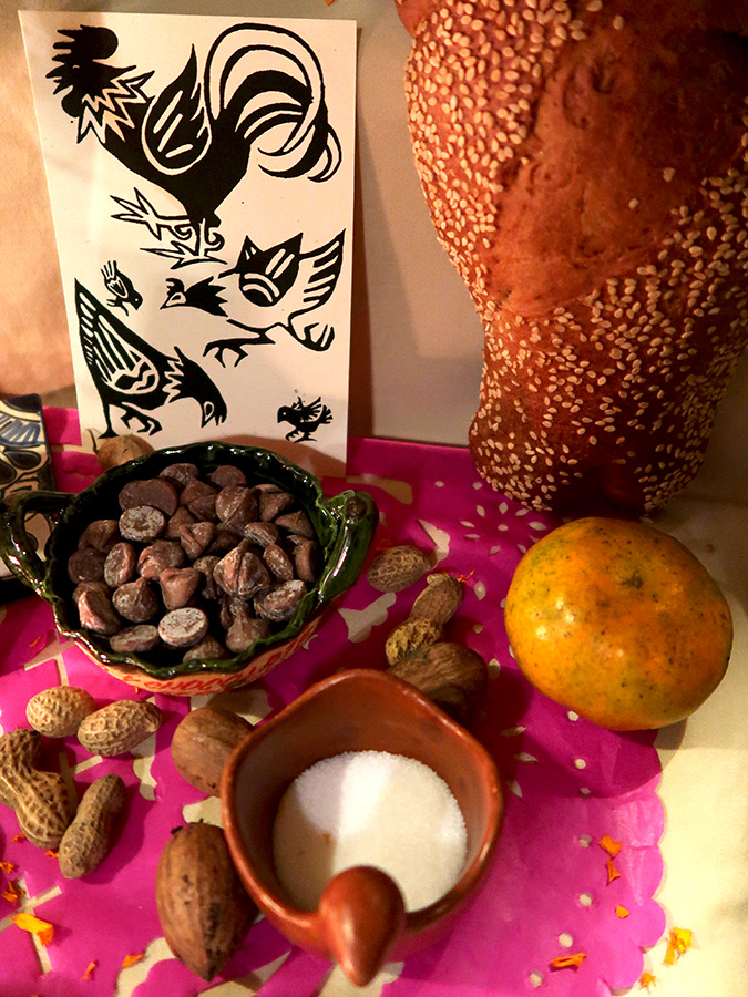 There is salt to make sure the souls stay pure and chocolate, peanuts, pecans, apples, mandarin oranges, and pan de muertos (Day of the Dead bread) to nourish them.