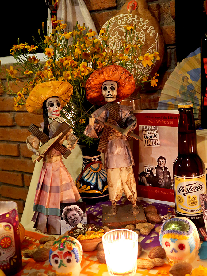 A yellow (the color of death in pre-hispanic southern Mexico) cloth covers two chests; papel picado (cut tissue paper), signifying the union between life and death, has been added, along with the traditional flowers of Day of the Dead — cempasúchil and veruche (domesticated and wild marigolds), their scent to guide the spirits, and cockscomb to symbolize mourning. Visitors brought the sunflower and, since my grandfather, father, and father-in-law were avid gardeners, it is for them!
