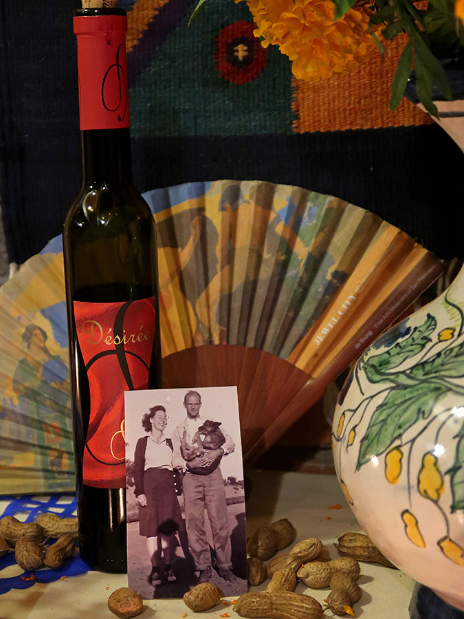 There are other cherished friends and relatives on my altar, but pride of place goes to my parents. For my father, who was killed when I was only two and a half, there is beer (below the above photo) — alas Victoria not Burgermeister! And for my mother, a fan to cool herself as she dances and a bottle of port to sip before she sleeps.